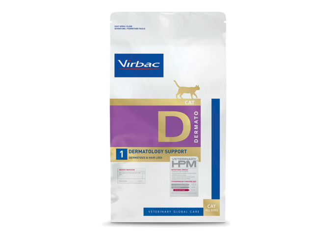 „Virbac Vet HPM Cat Dermato D1“ idealiai tinka kaip visavertis dietinis ėdalas katėms, kenčiančioms nuo dermatozės arba per didelio plaukų slinkimo. Mažai alergenų turinčiame kačių ėdale nėra jautienos, glitimo, kukurūzų, kviečių, ryžių, sojų, kiaušinių ar pieno produktų.